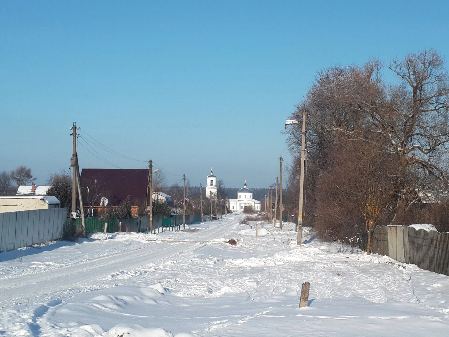 По обеим сторонам дороги расположились скромные деревенские дома, утопающие в снегу. Оголённые ветви деревьев, покрытые инеем, создают ощущение тихого и спокойного зимнего сна, охватившего природу. Чистое голубое небо свидетельствует о солнечном и морозном дне.