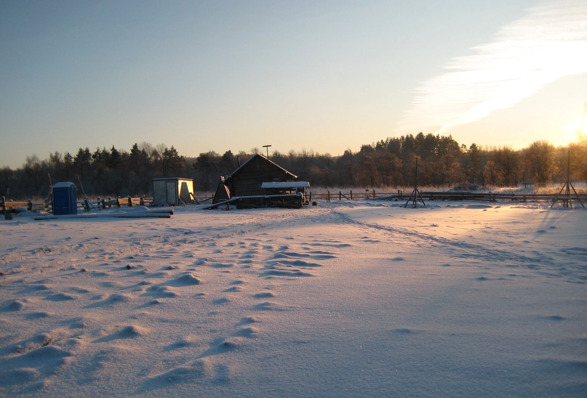На переднем плане простирается нетронутое снежное поле, где лишь едва видны следы, напоминающие о бренности земного пути. В среднем плане возвышается деревянная церковь Илии Пророка, являющаяся архитектурной доминантой погоста. Срубленная из добротного леса, она представляет собой образец традиционного северного зодчества, осеняя округу своим скромным, но благолепным видом.