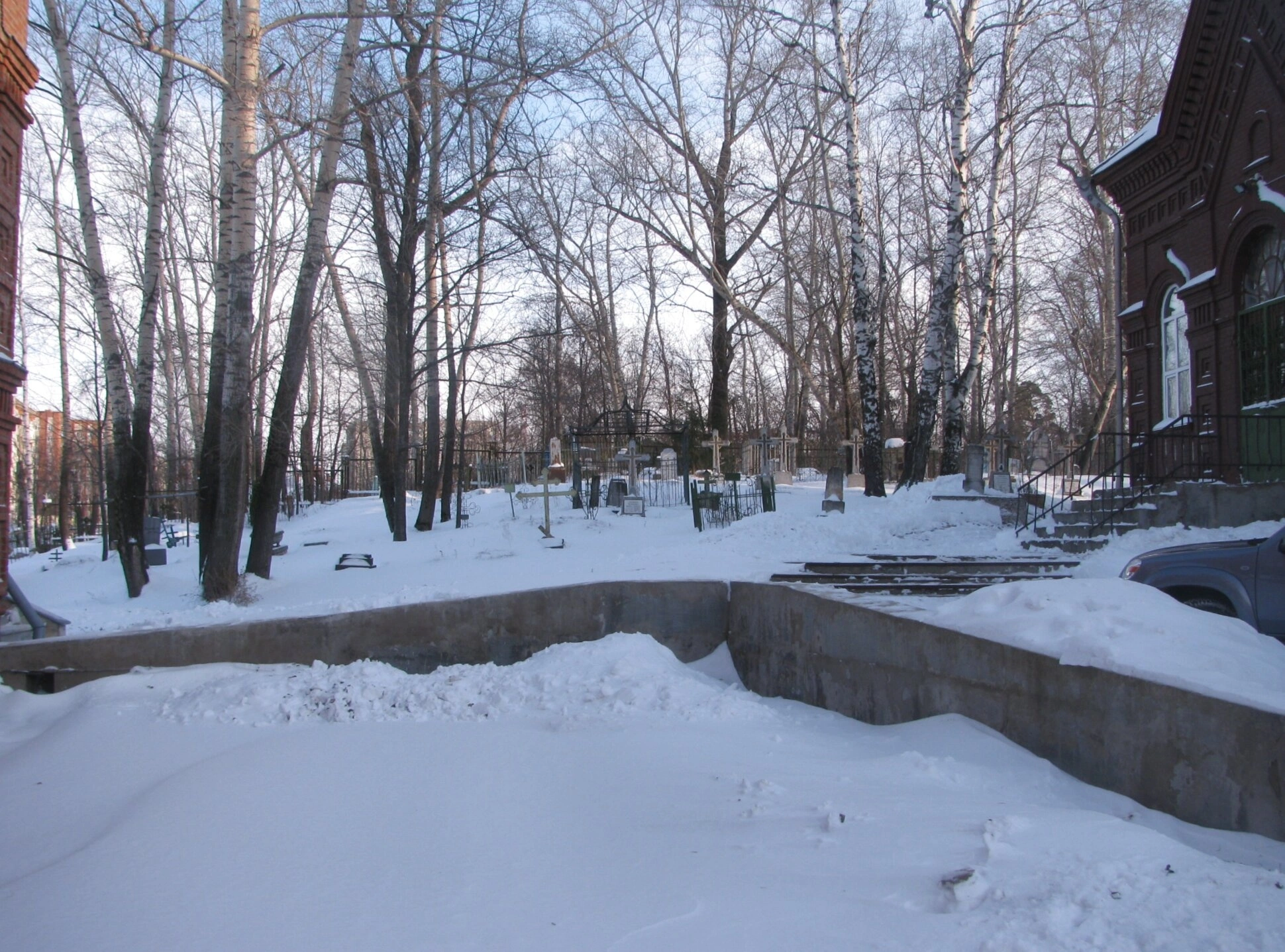 Зимний вид на кладбище и Преображенскую церковь в Воткинске