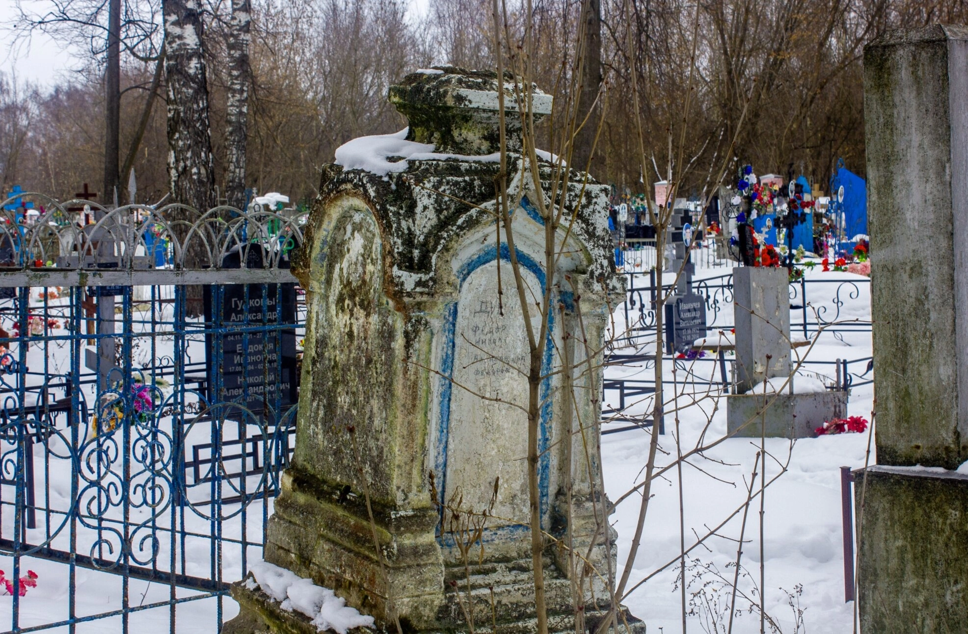 Общий пасмурный зимний пейзаж наполнен тишиной и умиротворением, характерными для православных кладбищ. Отсутствие людей на фотографии позволяет сосредоточить внимание на духовной составляющей места вечного упокоения и архитектурных особенностях старинных надгробий.