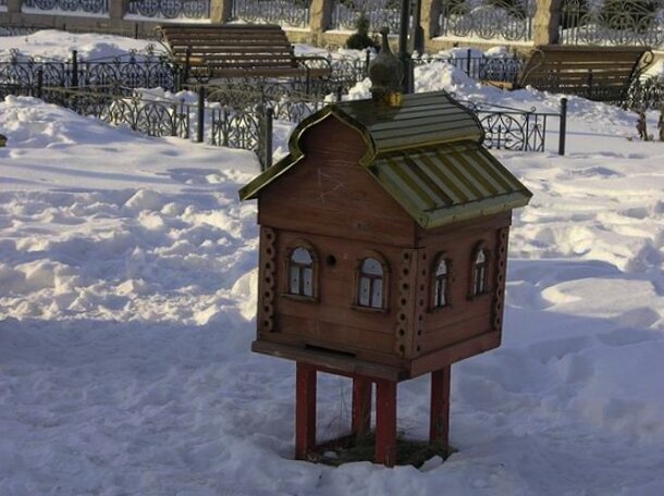 На представленной фотографии запечатлён уголок территории Свято-Троицкого мужского монастыря в городе Тюмени в зимнее время. В центре композиции располагается деревянная кормушка для птиц, искусно выполненная в виде небольшой резной избушки с оконцами и двускатной кровлей. Это благочестивое сооружение, установленное на четырёх столбиках, служит проявлением христианской заботы о Божьих творениях в суровых условиях сибирской зимы.