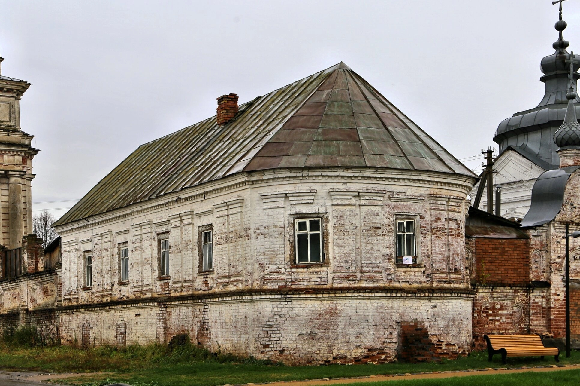 Состояние здания на изображении свидетельствует о его почтенном возрасте и сложной истории. Частично обветшавшая кирпичная кладка и следы ремонтных работ говорят о периодах запустения и последующего восстановления святыни. Наличие кирпичной ограды и других церковных построек на заднем плане подчеркивает значение этого места как центра духовной жизни для местных жителей.