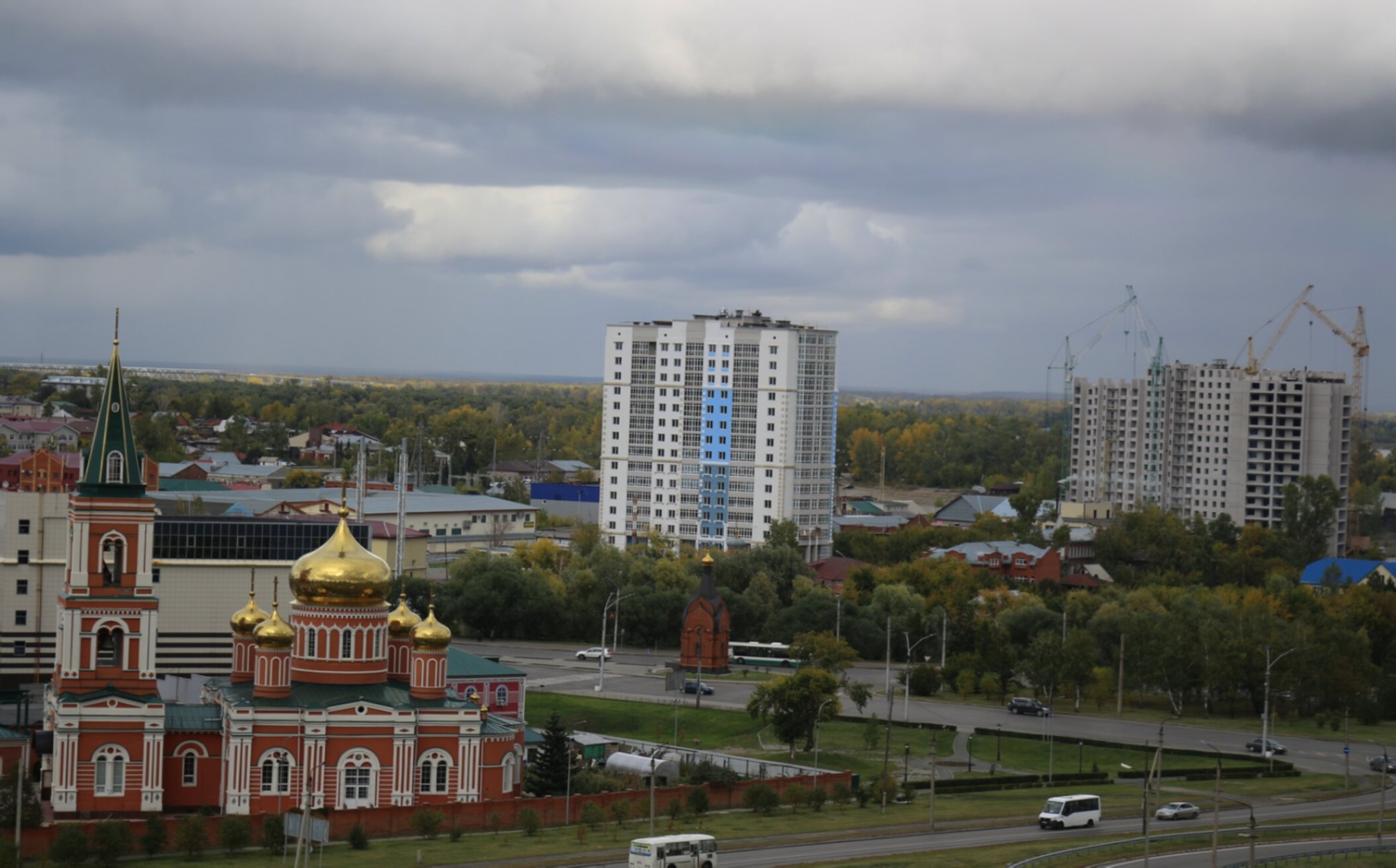 На фотографии запечатлена Знаменская церковь в Барнауле — один из старейших православных храмов города, являющийся архитектурной доминантой Знаменского женского монастыря. Снимок выполнен с возвышенности, что позволяет оценить величественный вид храма и его гармоничное сочетание с городским ландшафтом. На переднем плане изображен сам храм, выполненный в красно-белых тонах с золочеными куполами, устремленными в небо. Высокая колокольня, восстановленная в 2012 году, символизирует возрождение духовной жизни после decades забвения.
