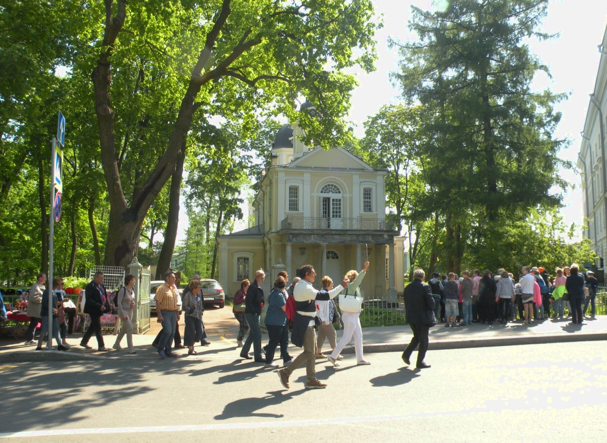 Снимок сделан в солнечный летний день. Храм окружён густой зеленью деревьев, которые создают тень на фасаде. Перед церковью проходит асфальтированная дорога и тротуар. На переднем плане и на тротуаре видна группа людей, вероятно, туристов или прихожан. Один из них, одетый в белую куртку и тёмные брюки, жестикулирует. Люди придают кадру живость, но их изображение не является крупноплановым.