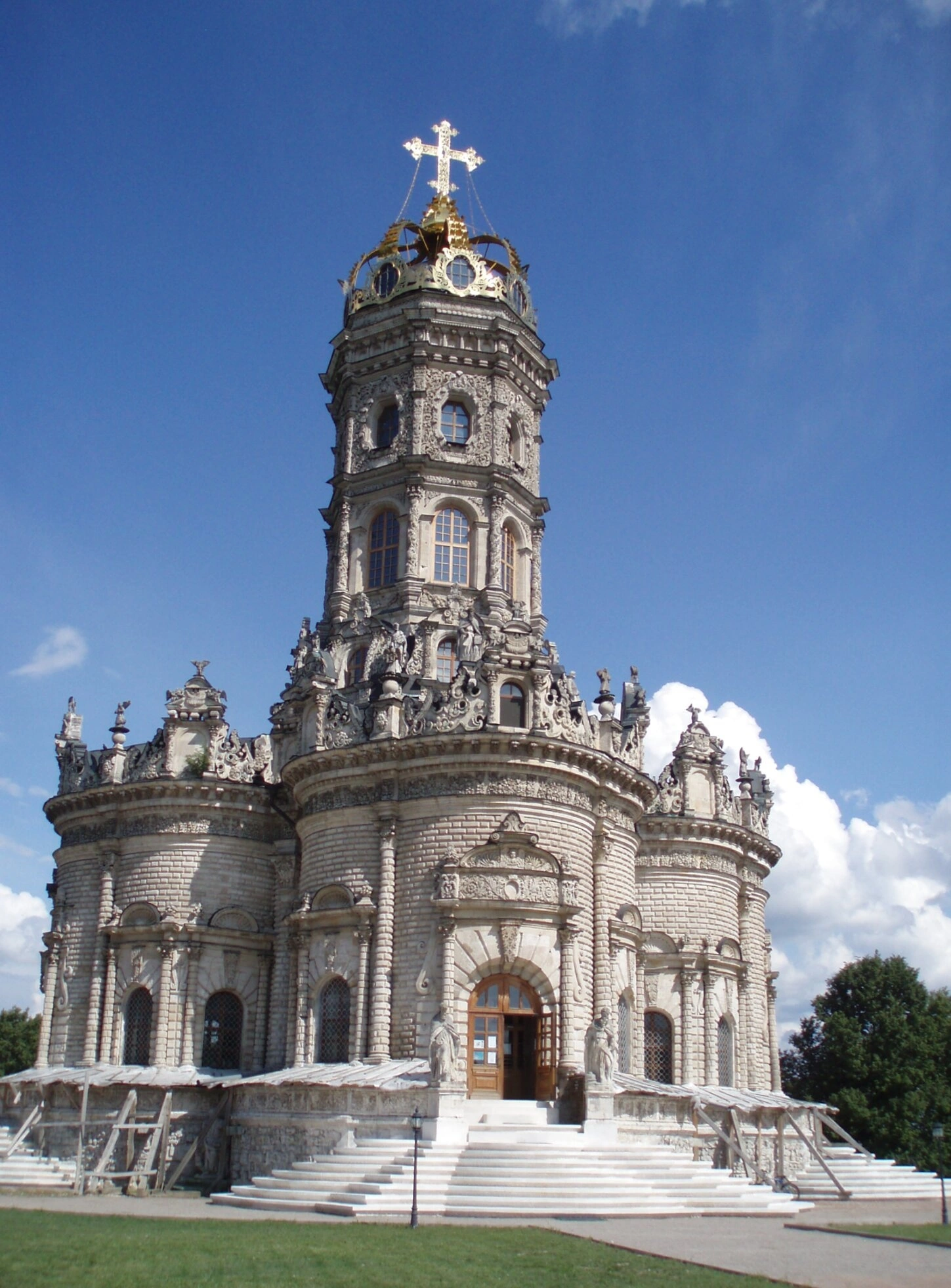 На представленной фотографии запечатлён вид на Знаменскую церковь в подмосковной усадьбе Дубровицы. Этот православный храм, освящённый в честь древненовгородской иконы Знамение Божией Матери, является выдающимся памятником архитектуры рубежа XVII–XVIII веков. Его устремлённая ввысь центрическая композиция с 12-лепестковым планом и центральным столбом, увенчанным ажурной золочёной короной, создаёт неповторимый архитектурный образ.