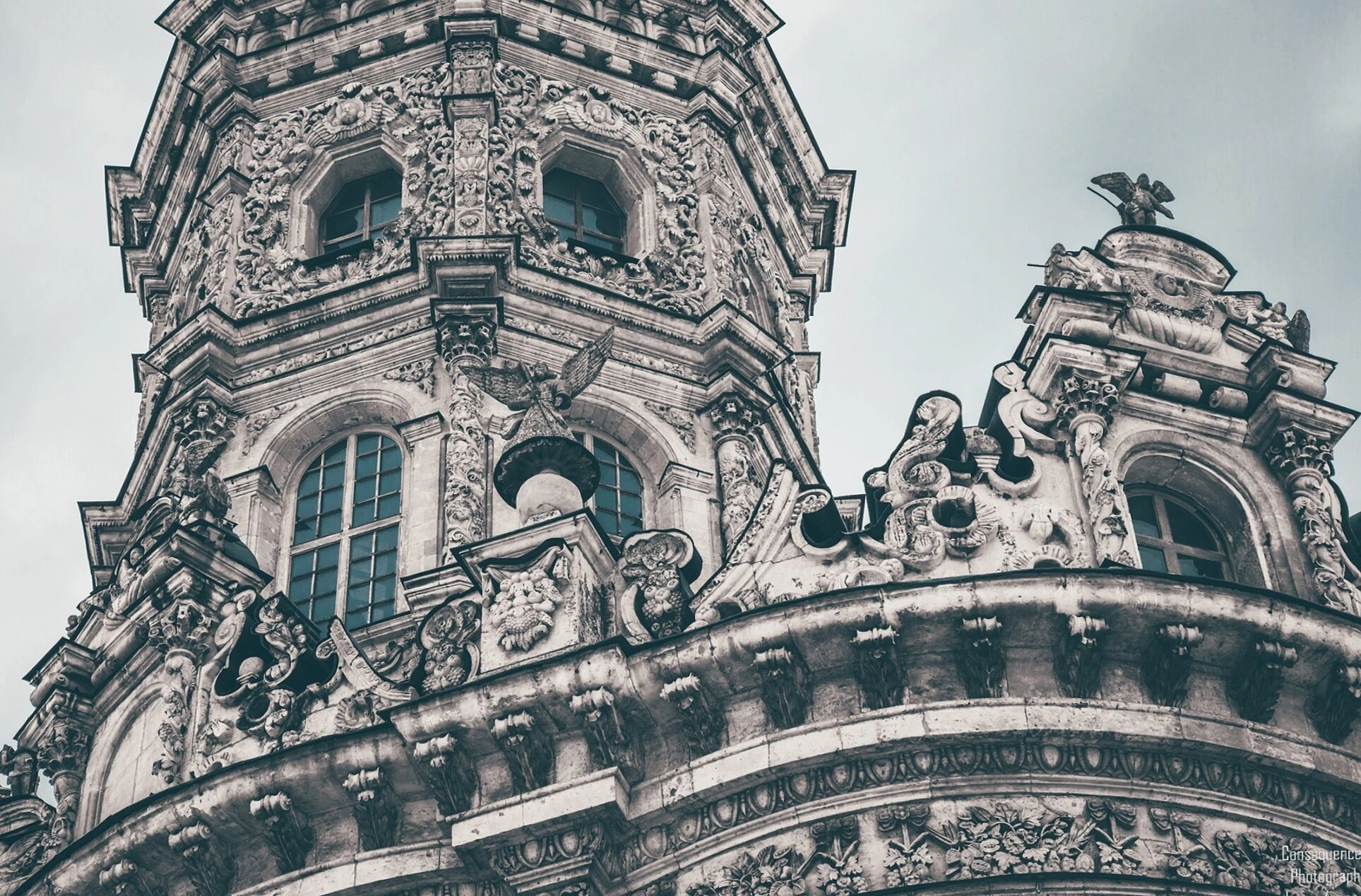 Монументальность храма подчёркнута перспективой съёмки, а монохромная гамма изображения акцентирует внимание на текстуре резного камня. Небо на заднем плане передаёт пасмурную атмосферу, что добавляет снимку художественной выразительности. Фотография даёт возможность детально рассмотреть уникальные элементы декора, созданные, по мнению исследователей, при участии итальянских мастеров.