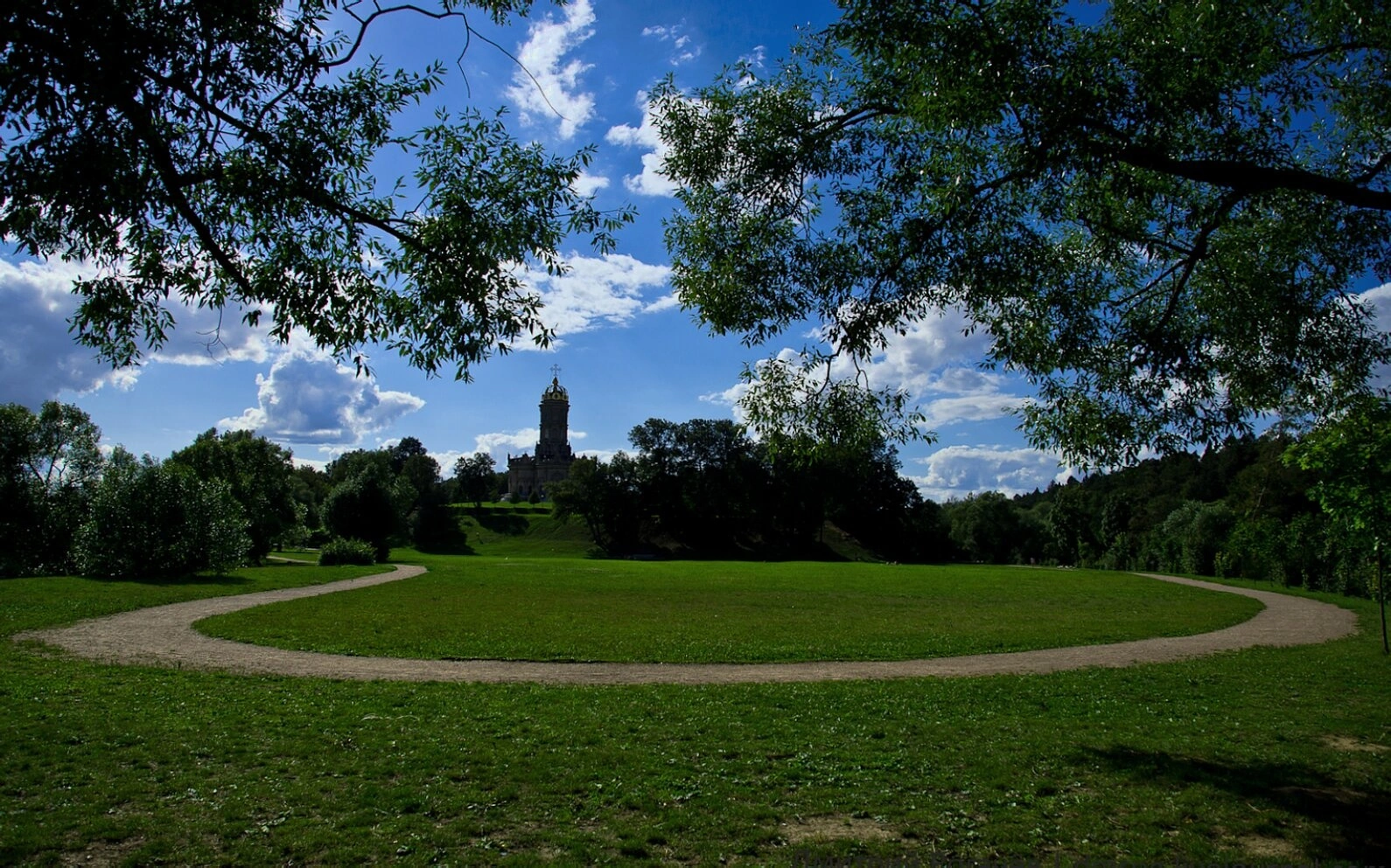 На переднем плане фотографии виден зелёный луг с извилистой дорожкой, ведущей к святыне. Деревья по краям кадра образуют естественное обрамление, направляющее взгляд к храму. Яркое дневное освещение подчёркивает благолепие церковных стен и насыщенную зелень окружающей природы.