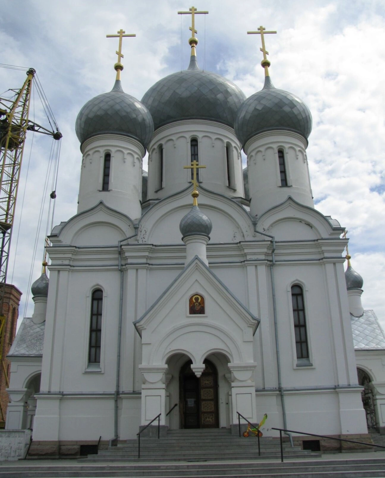 Святая обитель была возведена по проекту архитектора Петра Чернобровцева в период с 1994 по 1998 год. Чин великого освящения храма совершил архипастырь Сергий (Соколов) 25 июля 2000 года. На снимке слева можно видеть строительный кран, что указывает на ведущиеся в момент съёмки работы по благоустройству территории или развитию храмового комплекса, являясь свидетельством живой приходской жизни и заботы о внешнем благолепии места молитвы.