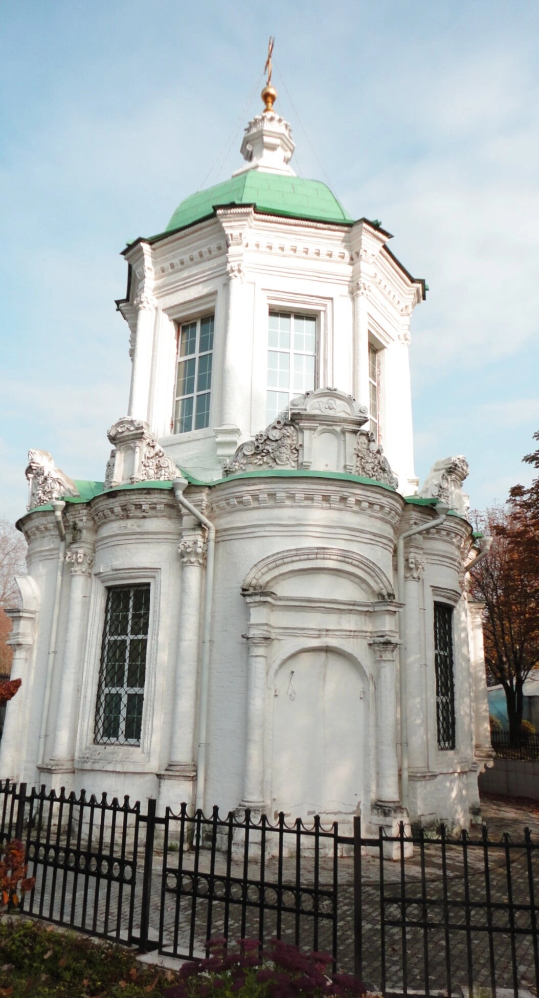 Церковь окружена чёрным металлическим забором, который отделяет её от окружающего пространства. На заднем плане видны деревья с осенней листвой и голубое небо с облаками, что придаёт снимку спокойную, лирическую атмосферу.