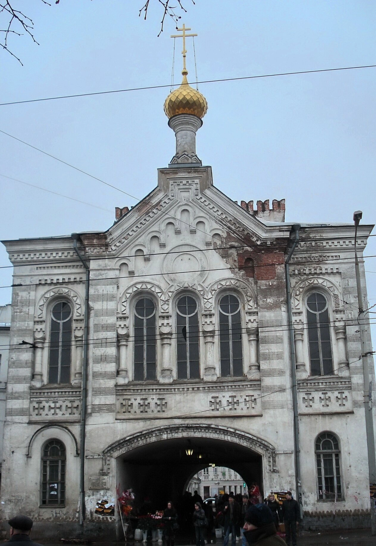 На фотографии можно наблюдать северный фасад здания, где в нижнем ярусе расположена большая арочная ниша, служившая в прошлом проездными воротами в церковный двор. Следы времени на кирпичной кладке и штукатурке лишь подчёркивают древность и духовную значимость этого места. Неспешные фигуры людей на переднем плане свидетельствуют о том, что храм и поныне находится в сердце городской жизни. Пасмурное небо, запечатлённое в день съёмки, добавляет кадру атмосферности и величия, напоминая о вечности и бренности бытия. Сегодня этот храм является не только действующим приходом, но и объектом культурного наследия, охраняемым государством.