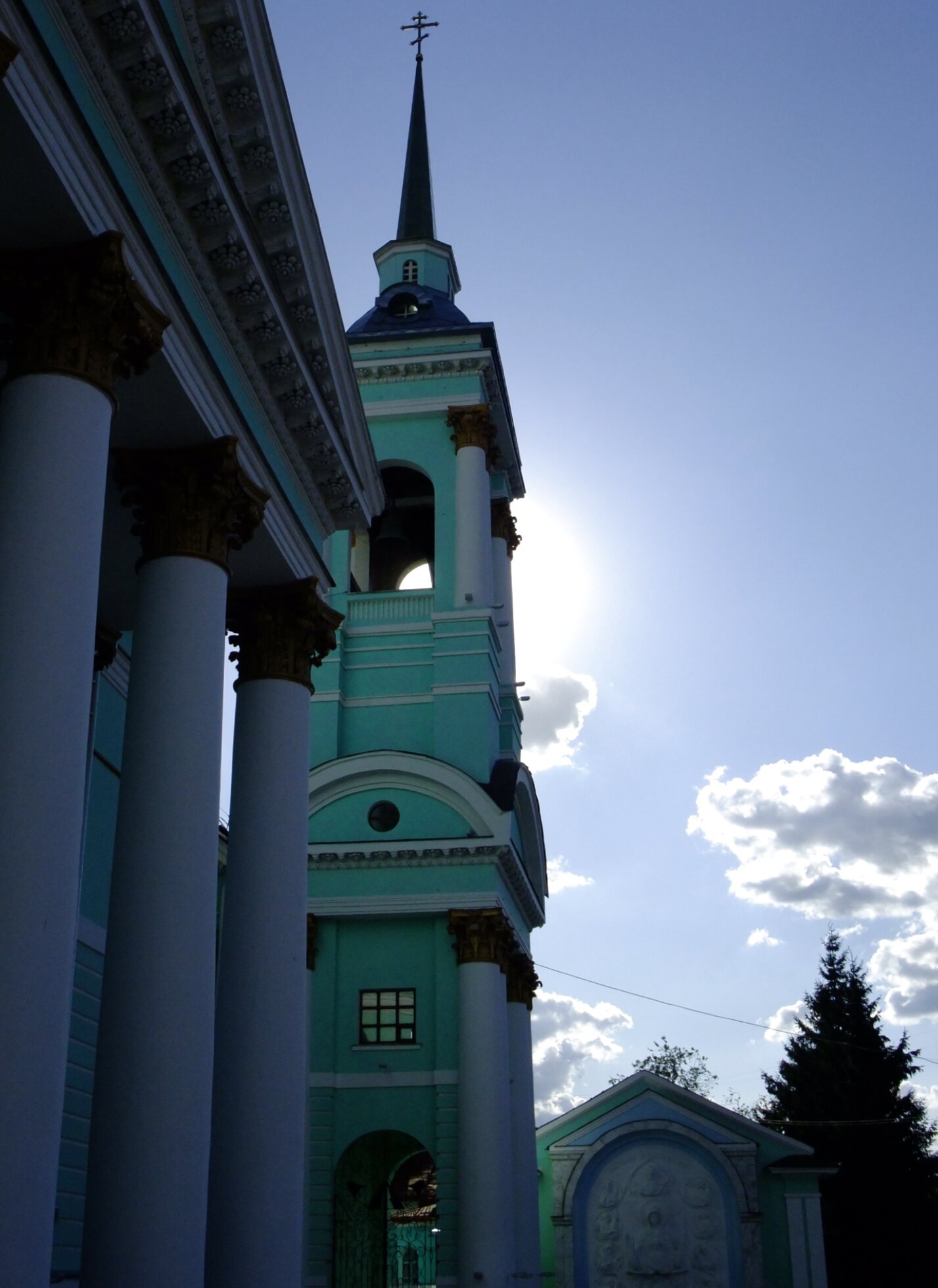 На снимке крупным планом показаны элементы архитектурного убранства собора: белоснежные колонны и антаблемент, составляющие портик, а также характерная бирюзовая окраска стен, которая гармонично сочетается с лазурным небом. Завершает композицию массивный купол, увенчанный золочёным крестом, символизирующим победу Господа нашего Иисуса Христа.
