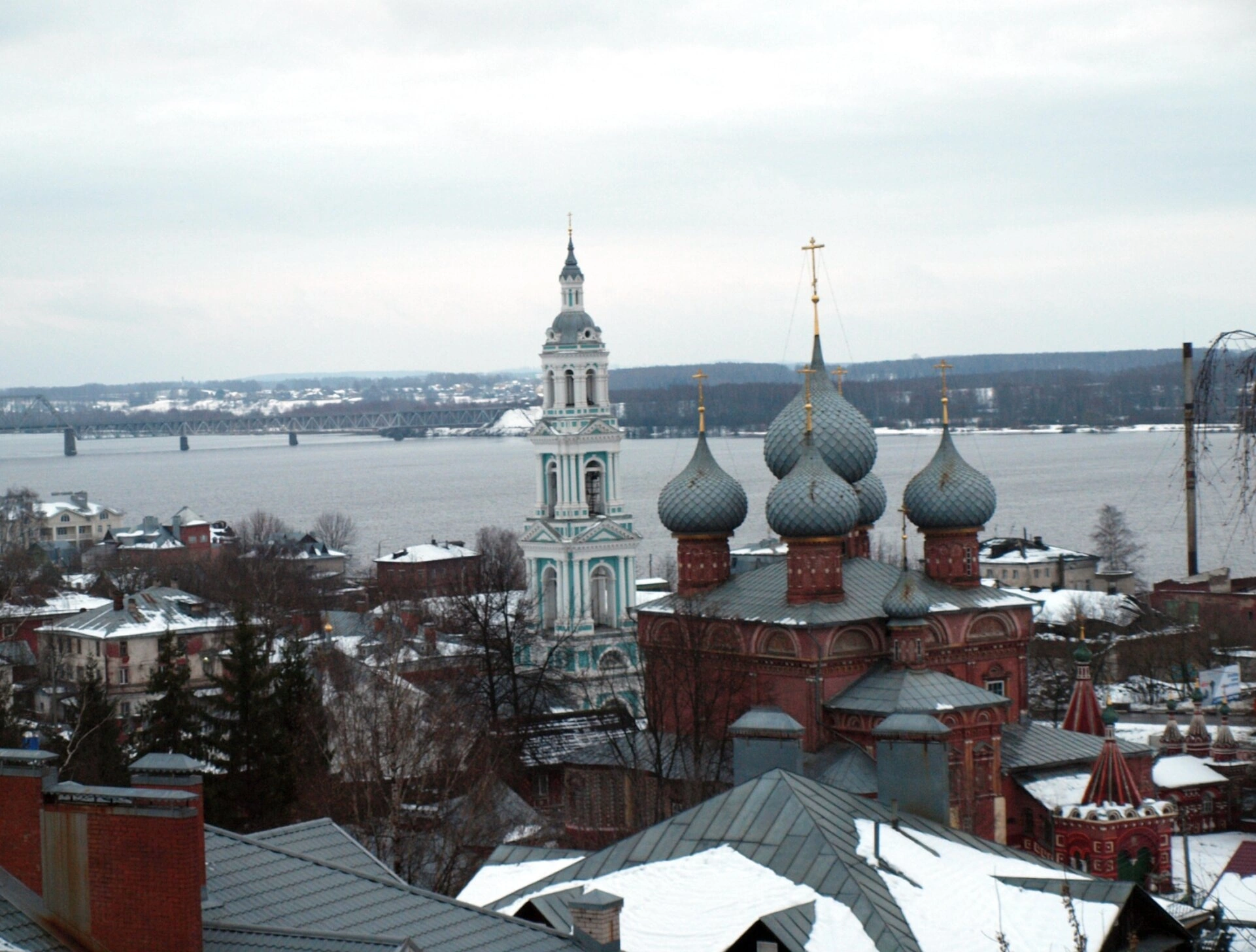На заднем плане открывается вид на великую русскую реку Волгу, которая в зимний период скована льдом. Через реку перекинут мост, соединяющий берега. Панорама демонстрирует гармоничное сочетание храмовой архитектуры и природного ландшафта, создавая целостный образ православной Руси.