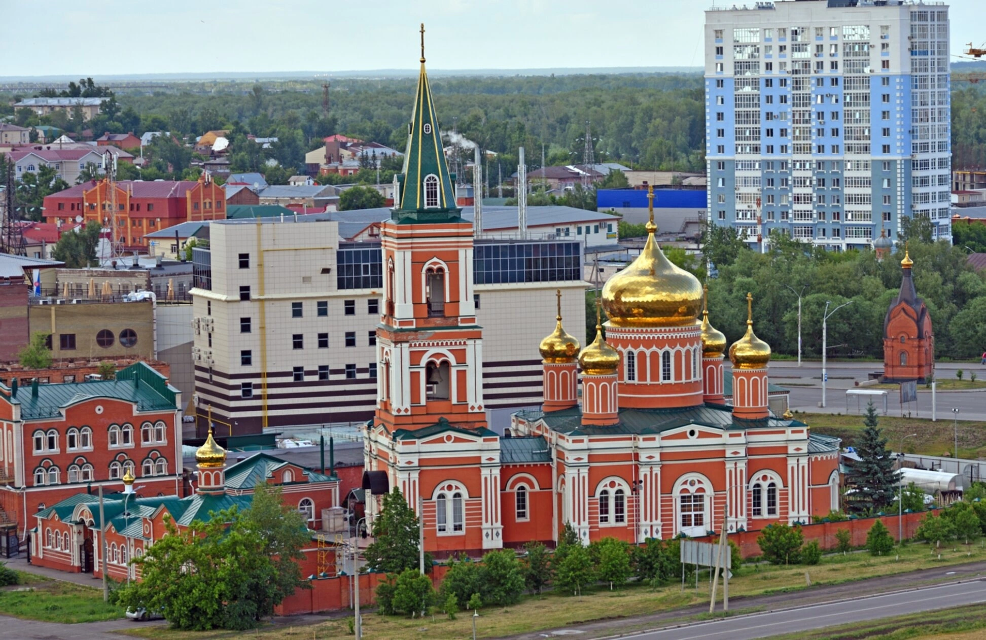 На представленной фотографии запечатлён Свято-Знаменский женский монастырь, расположенный в городе Барнауле. Главной доминантой обители является храм в честь иконы Пресвятой Богородицы «Знамение», чьи златые купола и стройная колокольня величественно возносятся к небу. Архитектурный облик храма, выполненный в традициях русского церковного зодчества, создаёт образ благодатного островка посреди городской суеты.