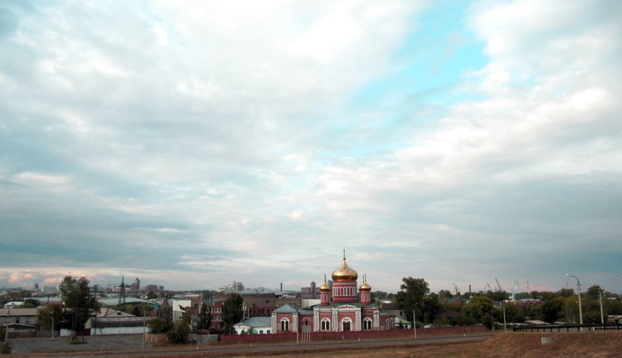 На представленной фотографии запечатлён Свято-Знаменский женский монастырь, располагающийся в городе Барнауле по улице Большая Олонская. Святая обитель, увенчанная златоглавыми куполами, сияющими под облачным небом, является духовным центром города и одной из главных православных святынь Алтайского края. Архитектурный ансамбль монастыря доминирует в окружающем городском пейзаже, состоящем из жилых построек и зелёных насаждений.