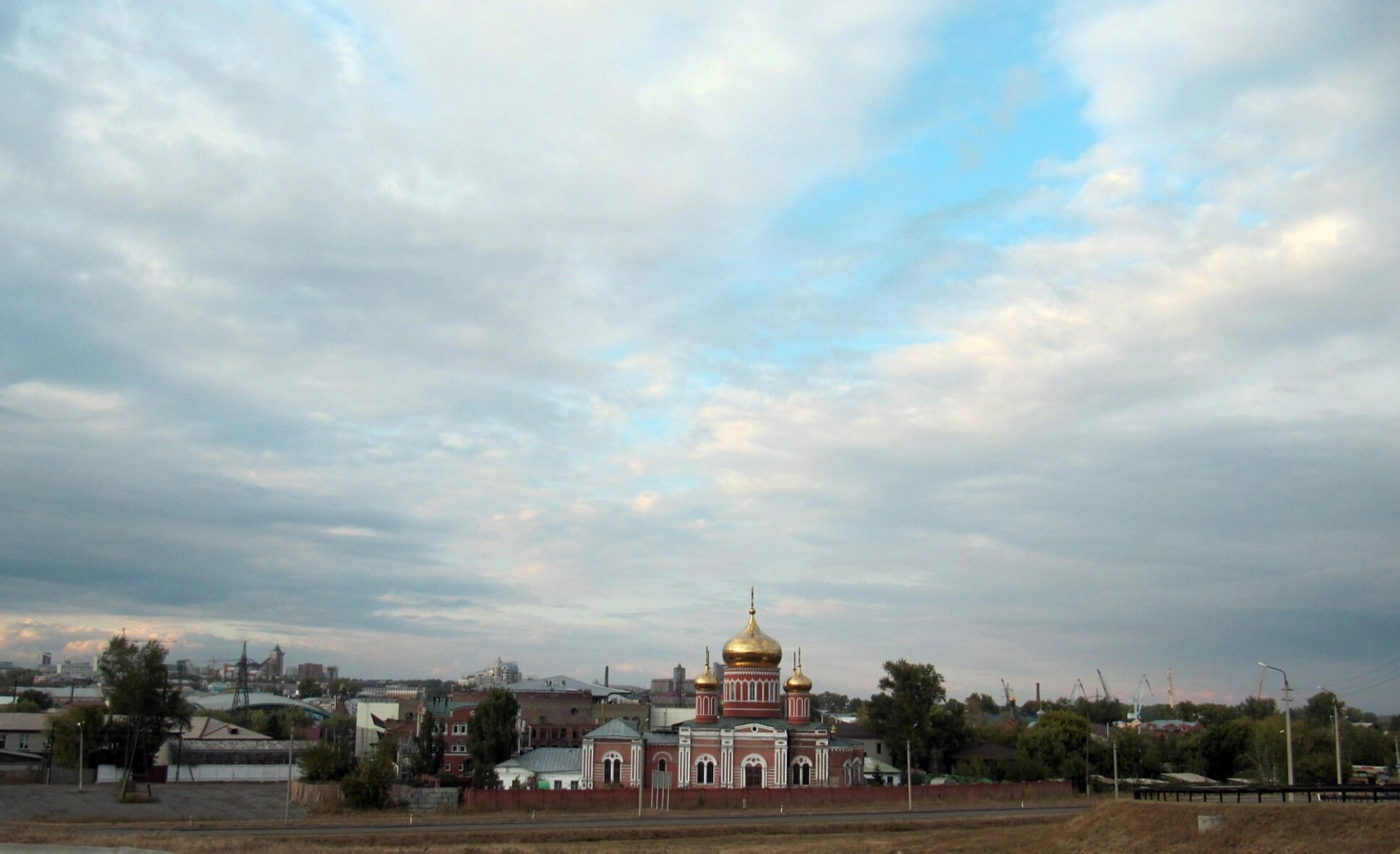 На представленной фотографии запечатлён Свято-Знаменский женский монастырь, расположенный в исторической части города Барнаула. Главной доминантой снимка является собор в честь иконы Божией Матери «Знамение», чьи златые купола, увенчанные православными крестами, сияют даже под покровом облачного неба. Монастырский комплекс гармонично вписан в городской ландшафт, будучи окружённым жилой застройкой и древесной растительностью, что подчёркивает неразрывную связь святой обители с жизнью мирян.