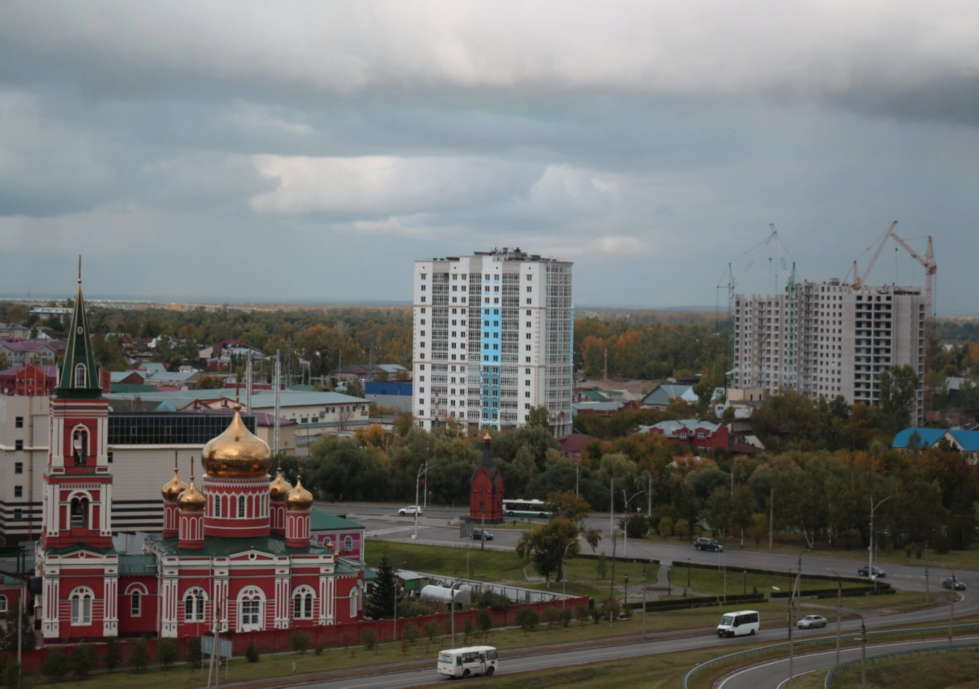 Фоном для всего городского пейзажа служит величественное облачное небо, напоминающее о бренности земного и вечности небесного. Данная фотография не просто фиксирует вид города, но и передаёт глубокий символизм сосуществования разных эпох, где духовная обитель продолжает быть неизменным ориентиром и источником благодати для всех жителей и гостей Барнаула.