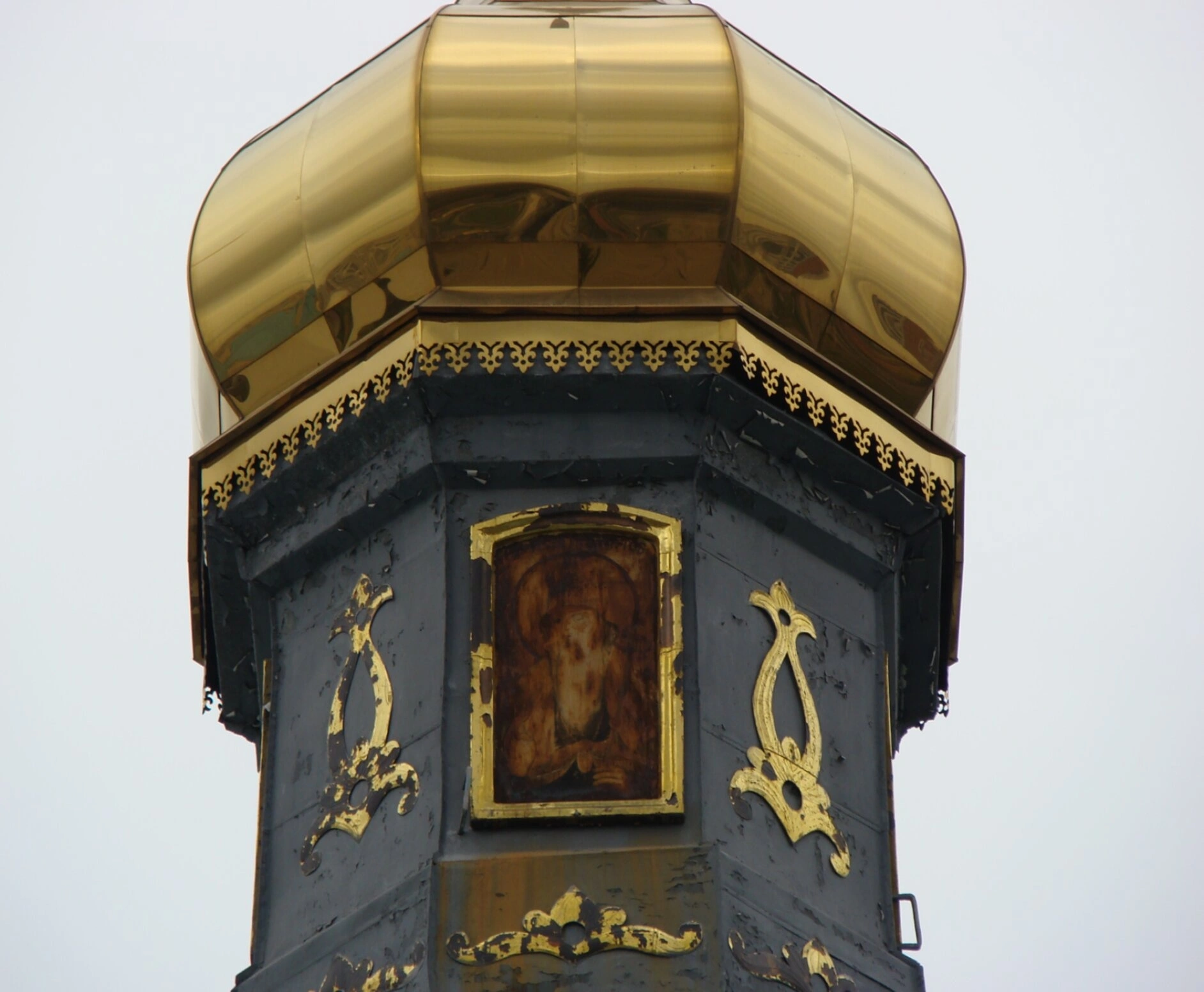 Основание купола, или так называемый барабан, выполнено из темного материала и богато украшено изящными золочеными орнаментами и декоративными элементами, придающими всей конструкции особую торжественность и благолепие. В нише барабана размещена почитаемая икона, лик которой обращен к молящимся и благословляет город.