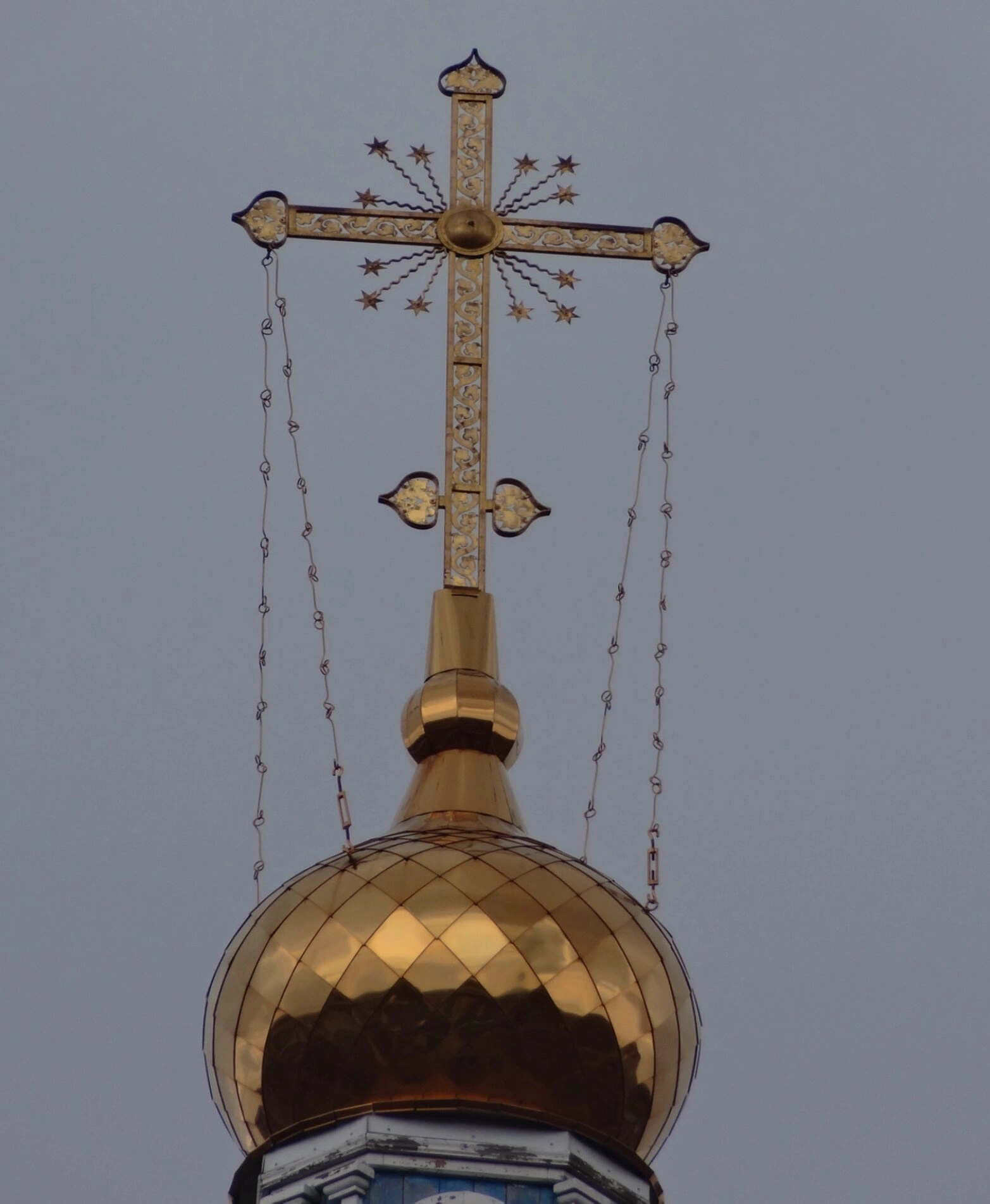 На вершине купола вознесён восьмиконечный православный крест, увенчанный изящной декоративной короной. Крест, также сияющий позолотой, украшен символическими звёздами и лучистыми венцами, что олицетворяет победу Христа над смертью и сияние Его Божественного света. От подножия креста к маковке купола спускаются изящные цепи, обеспечивающие его устойчивость и добавляющие композиции архитектурной завершённости.