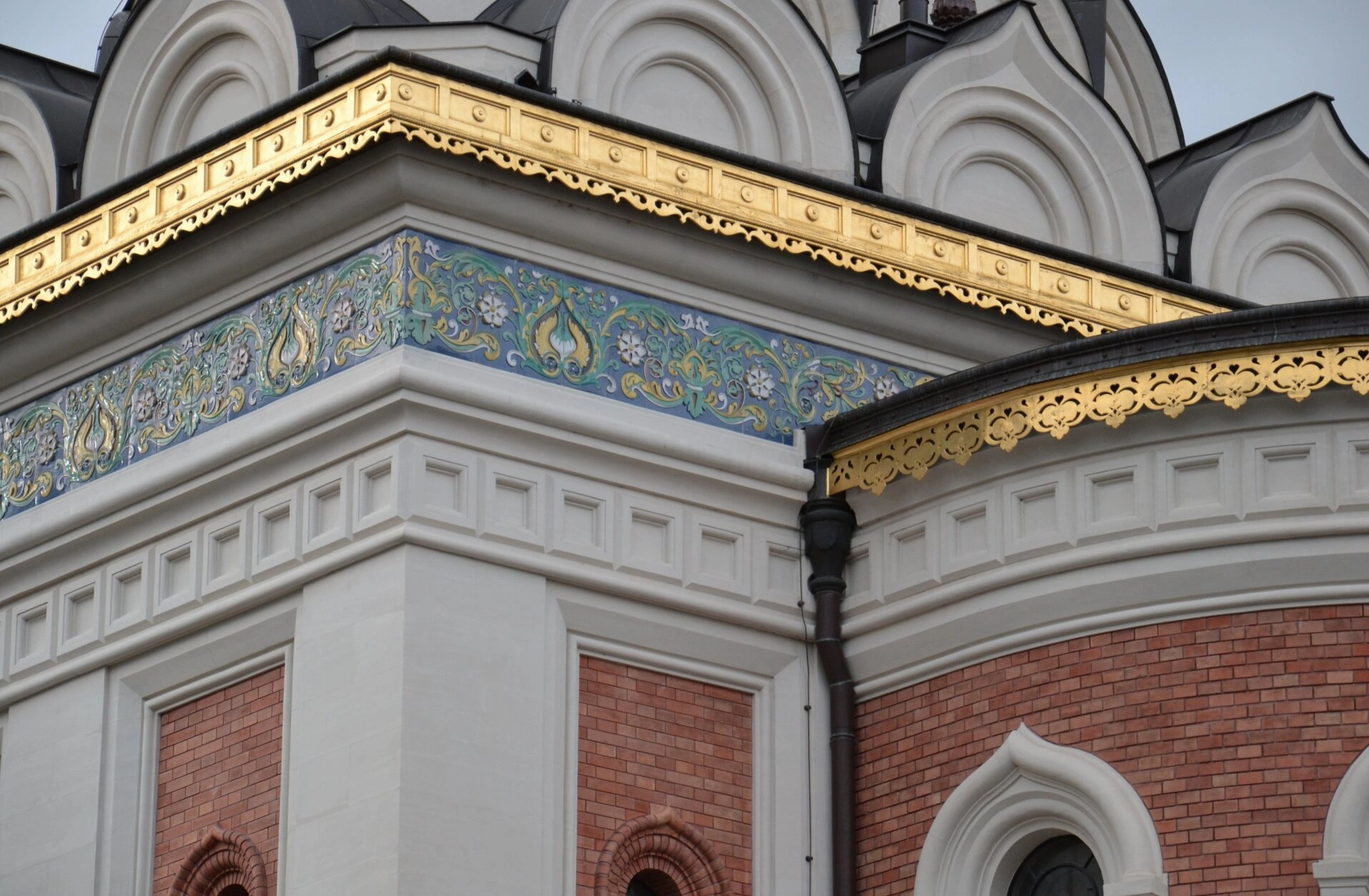 Под главным куполом видна часть чешуйчатой кровли, окрашенной в зеленый цвет, что создает прекрасный цветовой контраст и подчеркивает величие золотого покрытия. На переднем плане можно увидеть фрагмент второго креста, принадлежащего одной из малых глав, венчающих этот великолепный собор.