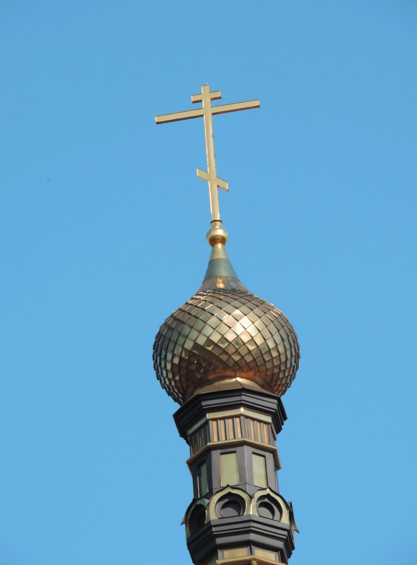 На представленной фотографии запечатлён величественный золотой купол одного из старейших храмов Подмосковья — Свято-Троицкого храма в городе Раменское. Купол, выполненный в традиционной для русского православного зодчества луковичной форме, обито чешуйчатым покрытием из сусального золота, которое ярко сияет под лучами солнца и символизирует Небесную славу и вечные горние ценности.