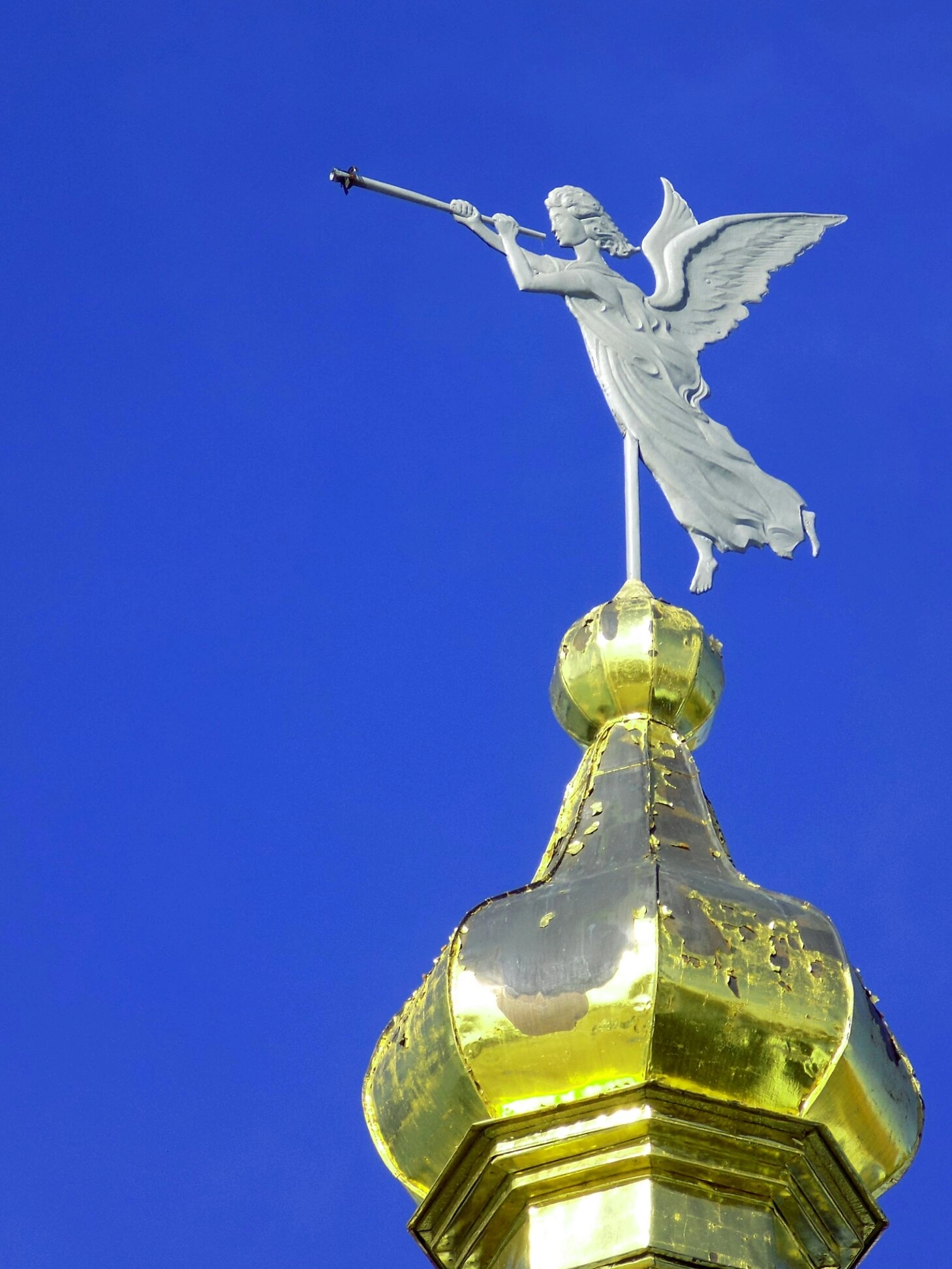 На представленной фотографии запечатлён величественный золотой купол главного храма Курской Коренной Рождество-Богородичной пустыни — Знаменского собора. Венчает его изящный шпиль, на котором установлен уникальный флюгер, выполненный в виде ангела, трубящего в золотую трубу. Этот узнаваемый символ обители чётко вырисовывается на фоне безмятежного небесно-голубого неба, что создаёт возвышенное и одухотворённое настроение.