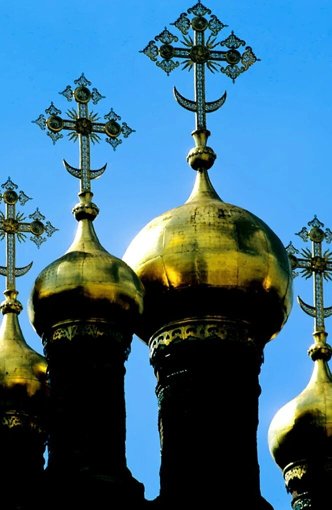 На снимке видны пять золочёных глав луковичной формы, ярко освещённых солнцем. Эти купола являются частью уникального архитектурного решения: в конце XVII века над комплексом теремных церквей была сооружена общая кровля, на которой на тонких изящных барабанах разместились одиннадцать главок, образующих три совмещённых пятиглавия. Каждый купол увенчан восьмиконечным православным крестом. Кресты богато украшены ажурными орнаментами, а у их основания часто размещаются символические изображения звезды и полумесяца, что соответствует древней церковной традиции.