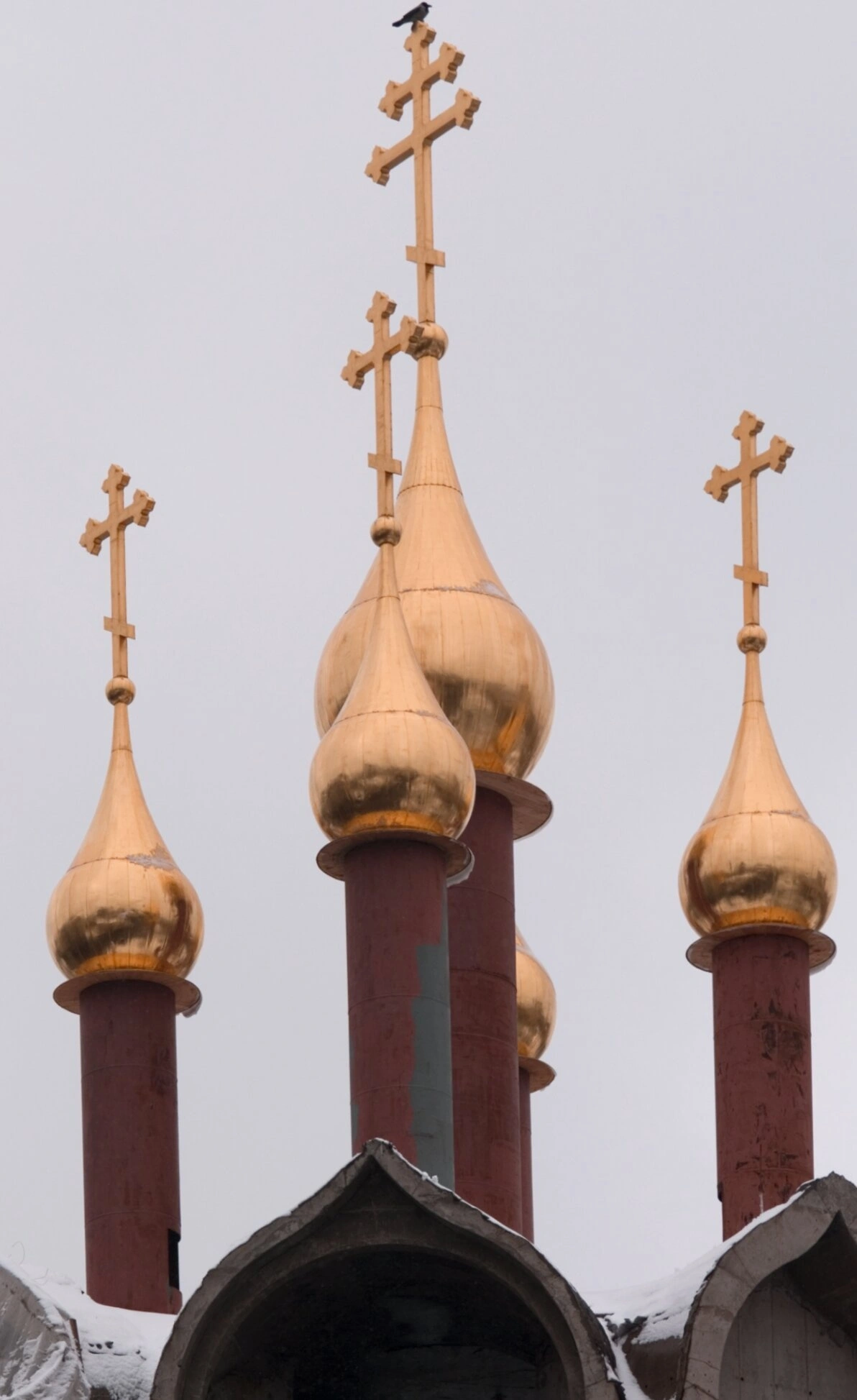 Каждая луковичная глава, покрытая золотом, увенчана традиционным восьмиконечным православным крестом, символизирующим искупительную жертву Христа. На одном из крестов, по Промыслу Божию, присела отдохнуть птица, что добавляет кадру одухотворённости и напоминает о божественном попечении о всей твари.