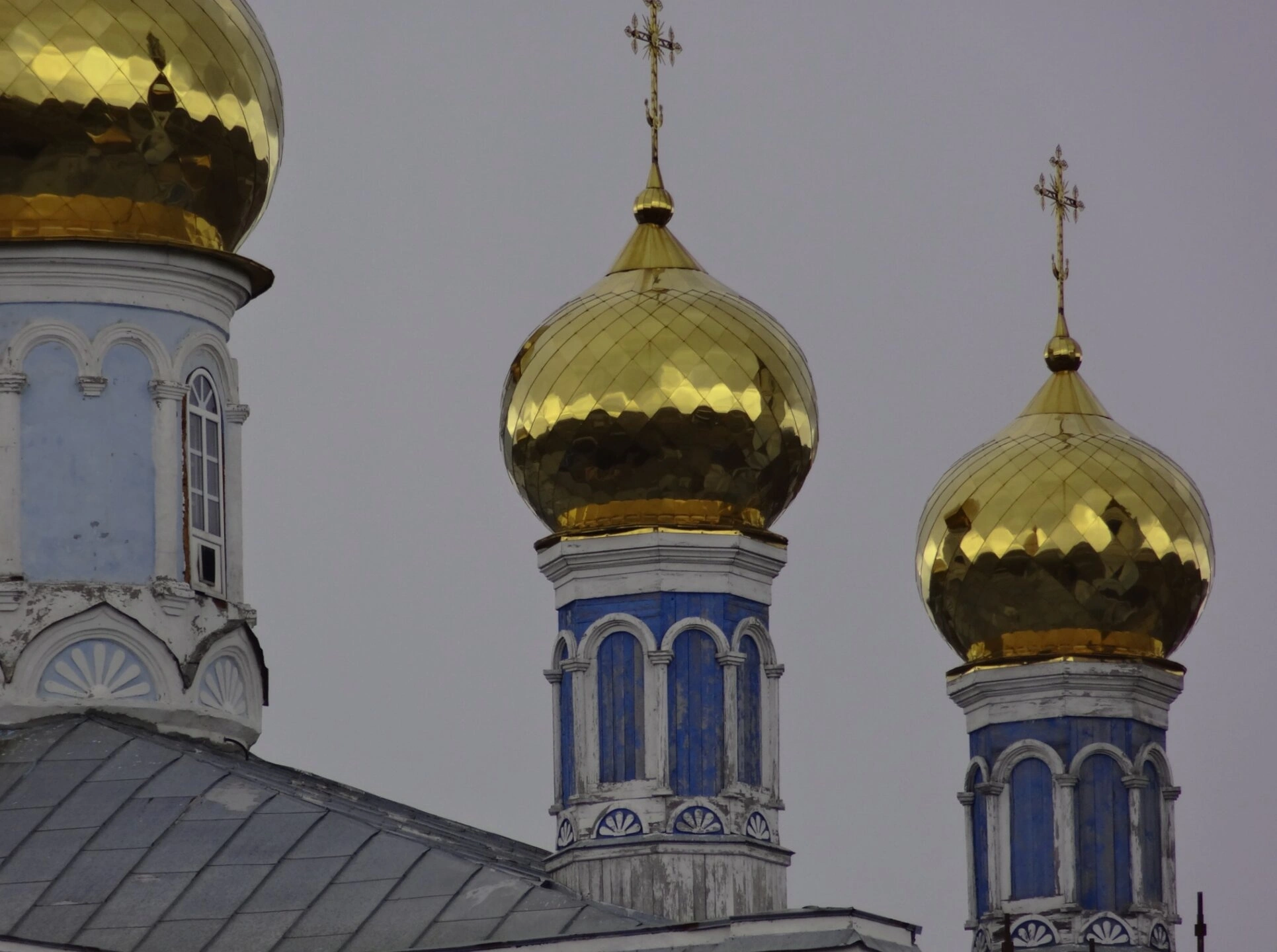На представленной фотографии запечатлён величественный вид Церкви Покрова Пресвятой Богородицы, что располагается в городе Каменске-Уральском Свердловской области. Главными доминантами кадра являются сияющие золотые купола храма, увенчанные православными крестами. Их луковичная форма, традиционная для русского церковного зодчества, чётко вырисовывается на фоне пасмурного неба, создавая возвышенный и благоговейный образ.