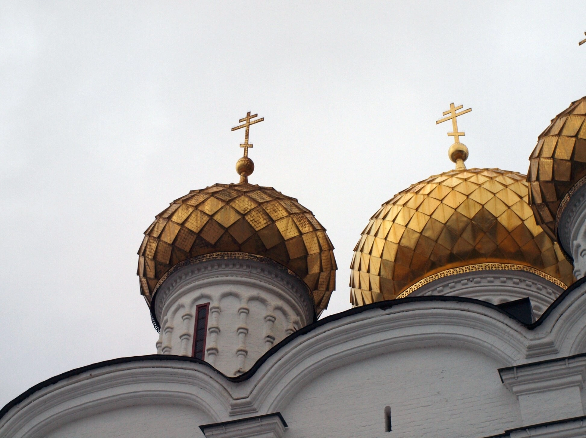 Каждый купол увенчан восьмиконечным православным крестом, символизирующим искупительную жертву Христа. На барабане одного из куполов просматривается узкое вертикальное окно с красной рамой – характерная архитектурная особенность собора, построенного в XVI столетии.
