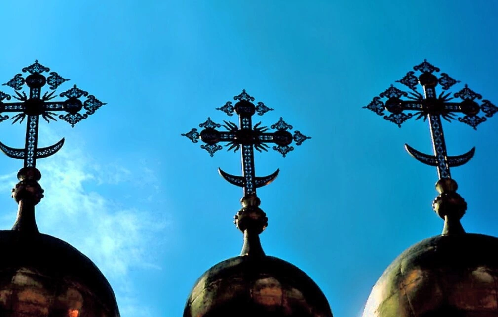 Каждый купол увенчан традиционным православным крестом, в основании которого находится полумесяц – символическая цата. В византийской традиции цата олицетворяла царскую власть, а в христианской символике она трактуется как якорь надежды, крещальная купель или евхаристическая чаша. Кресты на храме украшены сложным ажурным узором, что характерно для русского церковного искусства XVII века.