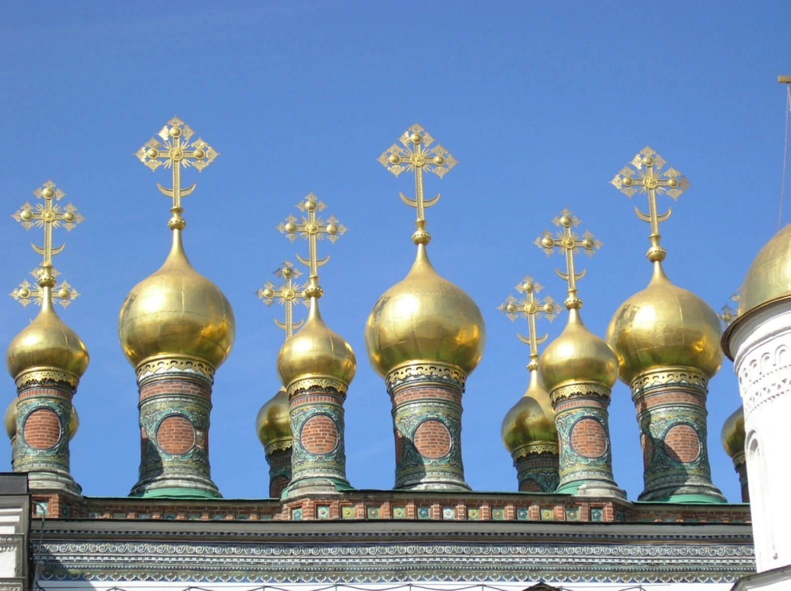 В нижней части изображения виден фрагмент белого резного карниза, являющегося частью оформления фасада собора. Чистое голубое небо, служащее фоном, подчёркивает яркое сияние золотых глав и нарядную полихромию изразцового декора.