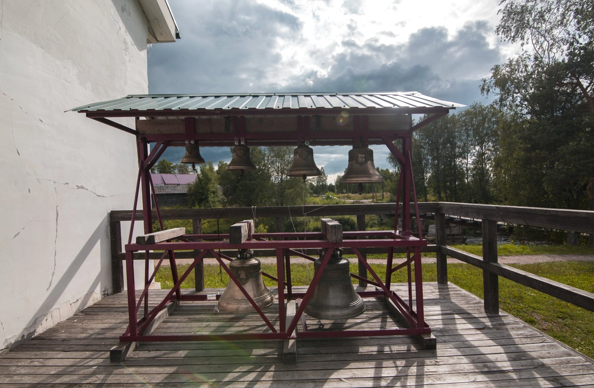 На заднем плане фотографии виден сам храм, а также деревянный забор и живописные северные деревья под пасмурным небом, что создаёт атмосферу благоговения и умиротворения. Церковь Смоленской иконы Божией Матери, у которой стоит эта звонница, была воздвигнута в 1828 году и является объектом культурного наследия. Она освящена в честь чудотворного образа Пресвятой Богородицы, именуемого «Одигитрия». Звонница же является не просто архитектурным элементом, а молитвой в бронзе, призывающей православных христиан к соборной молитве в стенах древнего храма.