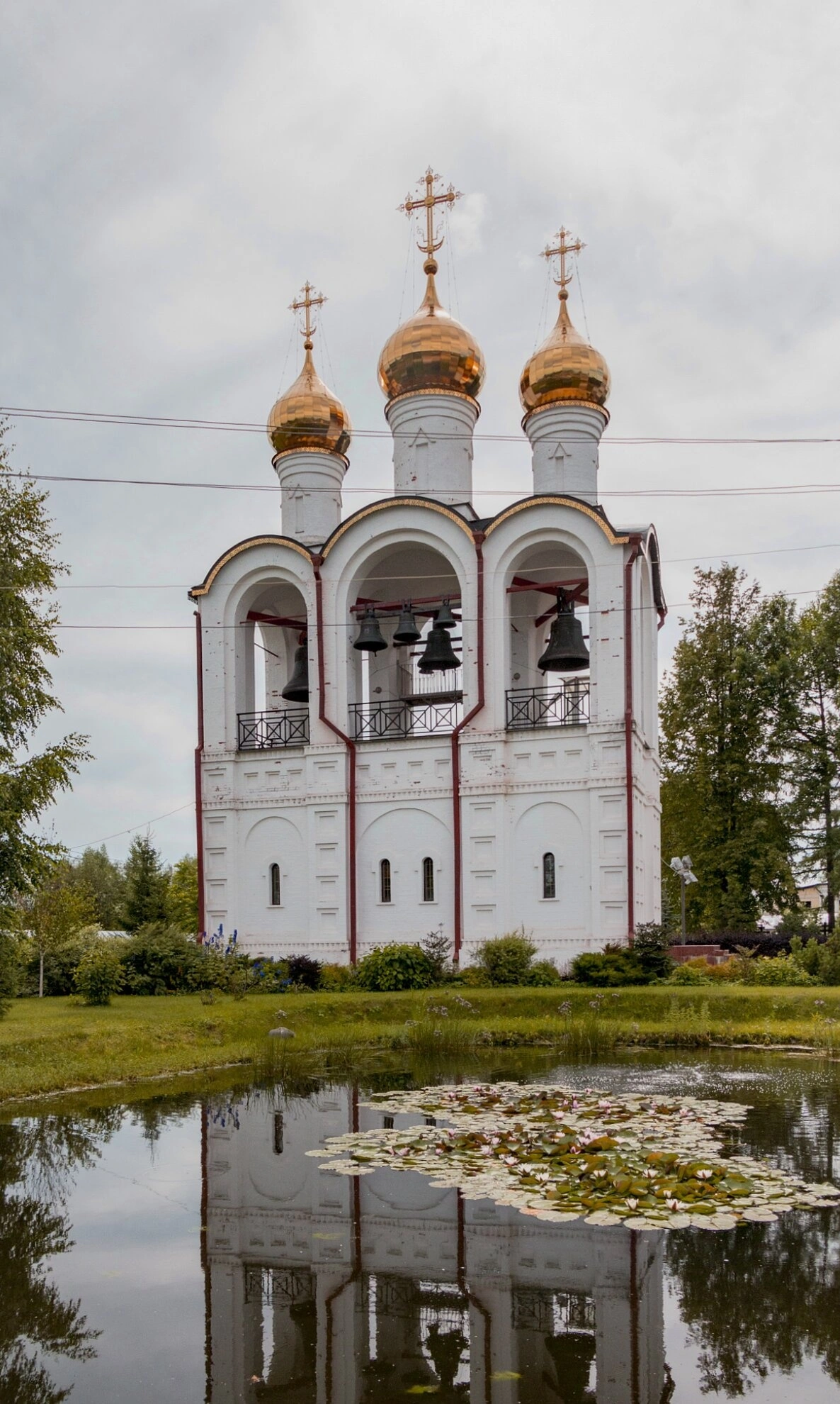 На представленной фотографии запечатлена величественная белокаменная колокольня Никольского монастыря в древнем граде Переславле-Залесском. Трёхъярусная звонница, увенчанная тремя златыми главами с крестами, гармонично отражается в глади монастырского водоёма, создавая образ небесного града Иерусалима. На переднем плане тихих вод видны листья кувшинок, подчёркивающие умиротворённость и благодать этого святого места.