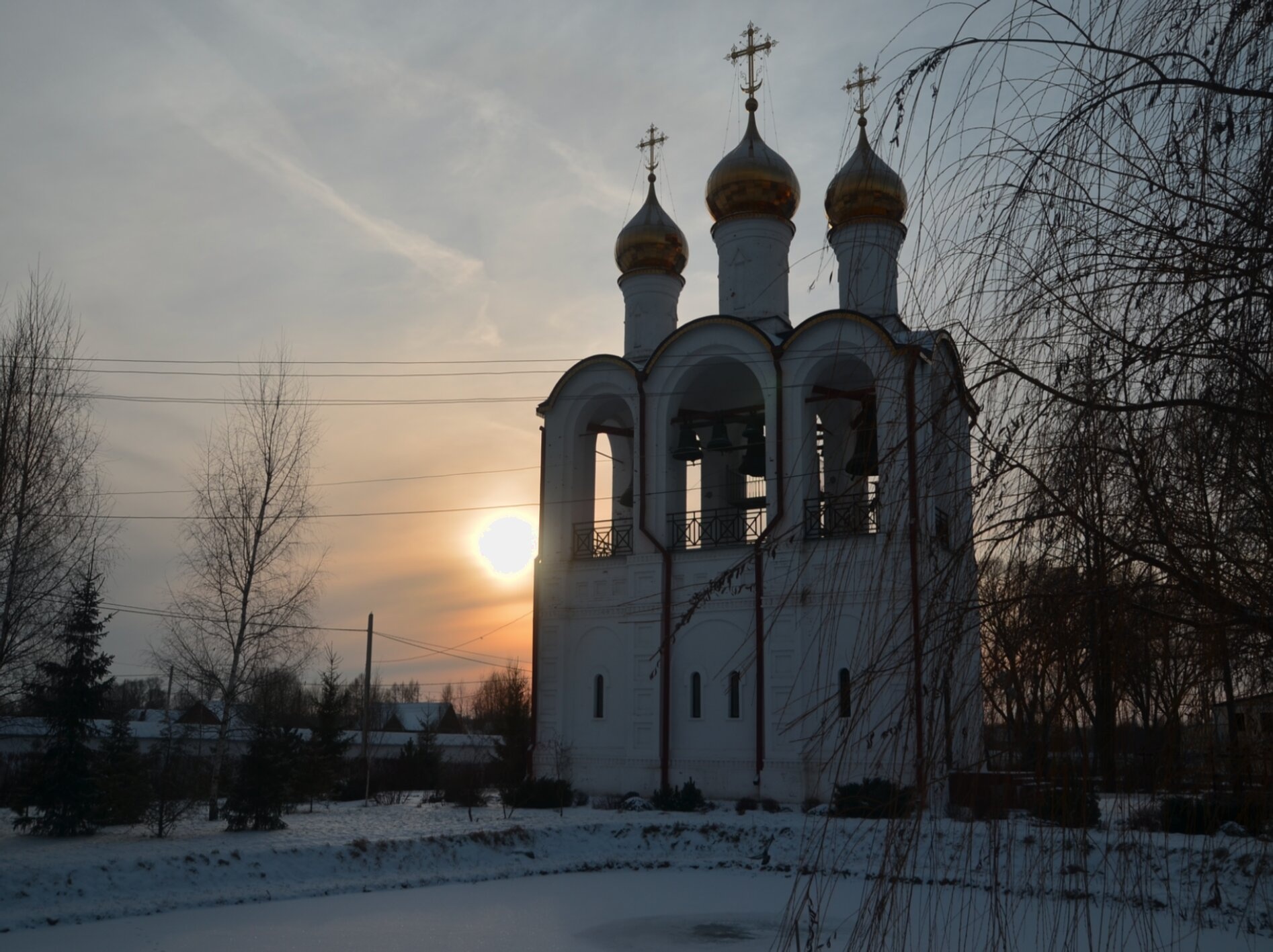 На представленной фотографии запечатлена величественная трёхпролётная трёхглавая звонница, возведённая на территории старинного Никольского женского монастыря в граде Переславле-Залесском. Белоснежный объём колокольни, увенчанный златоглавыми куполами с крестами, сияет на солнце, символизируя духовное возрождение древней обители. Сооружение было построено в 2000-х годах, став одним из ключевых элементов архитектурного ансамбля монастыря и свидетельством его восстановления после десятилетий запустения в годы богоборчества.